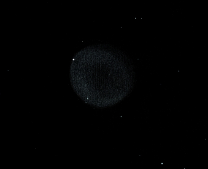 T406 à 295X le 13 février 2023 à La Caillère. Nébuleuse assez diaphane d'où un grossissement modéré. Pas de halo, le contour de la coquille est bien défini, ovalisé mais pas régulier. Centrale bien ponctuelle et lumineuse. |