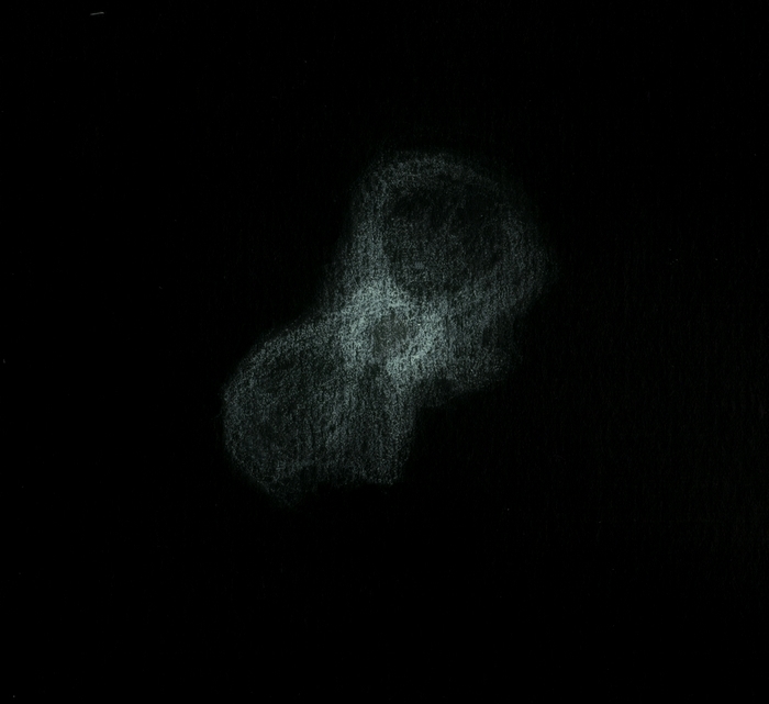 T406 à 880x, au CAV le 30 décembre 2021. Le seeing était moyen mais ce grossissement permet tout de même de cerner la forme alongée et un peu biscornue, ainsi que quelques rehauts lumineux. |